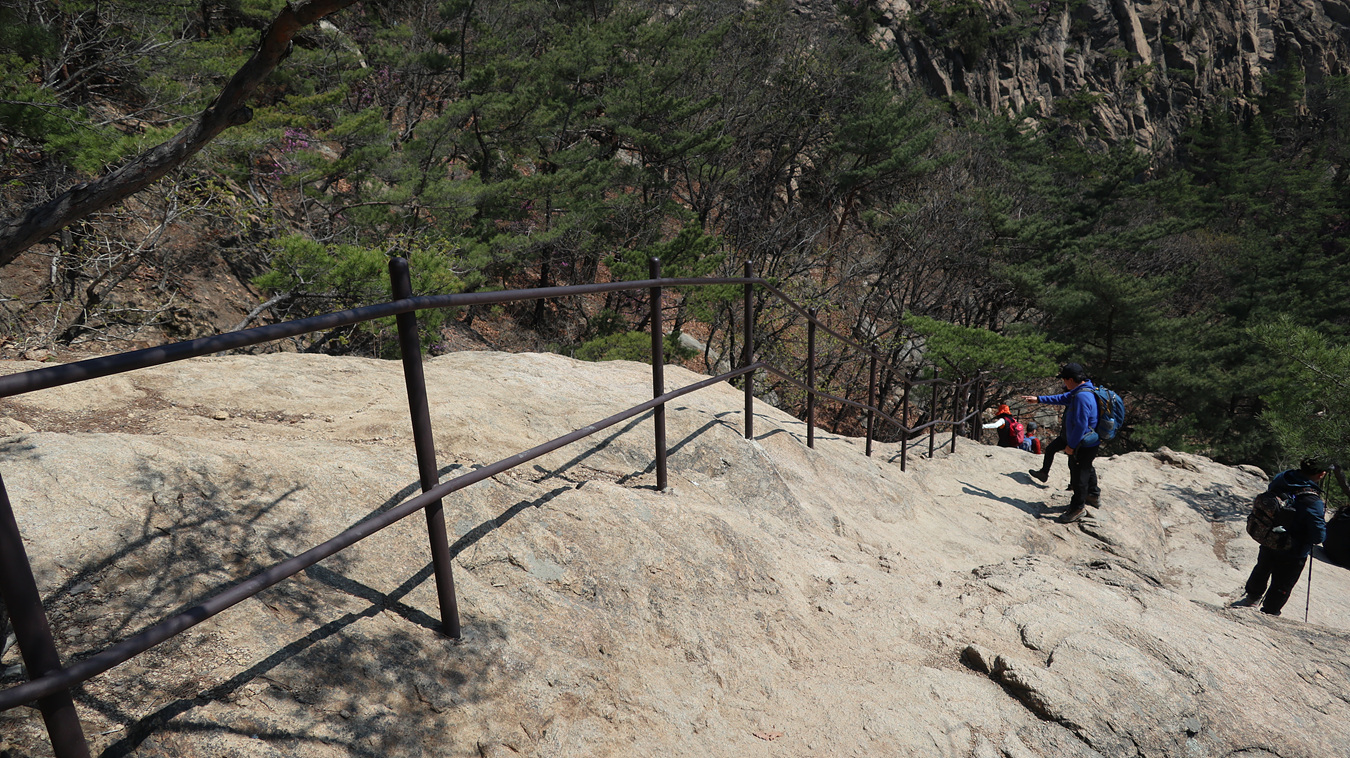 쇠줄을 걸어 놓아서 위험한길은 아니지만 경사가 심해서 조심스럽게 가야 한다,