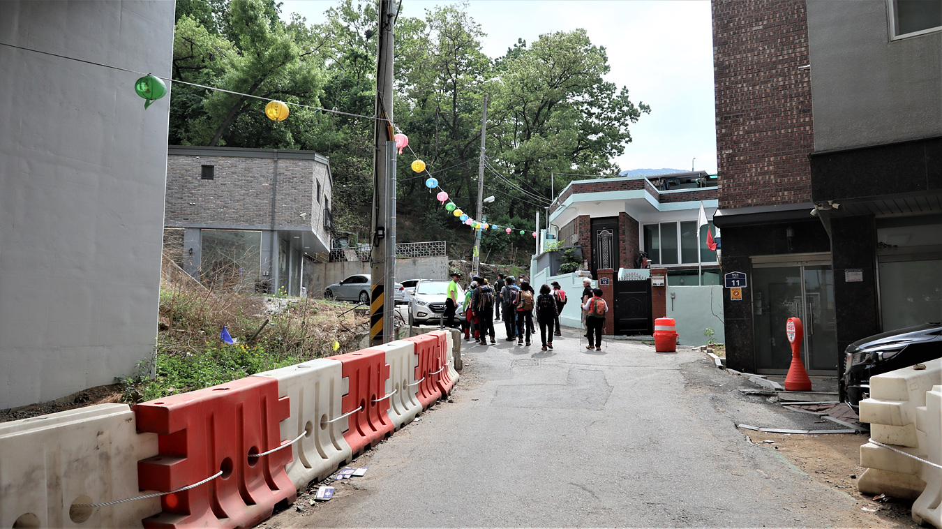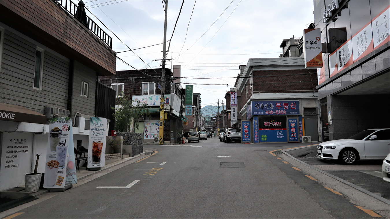 주택가 길을 따라가다가 두번째 골목길 갈림길에서