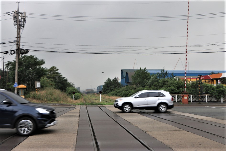 길 건너 맞은편을 구경하며 걷는다, 외부에서 포항제철소로 연결되는 철도 도 보인다,