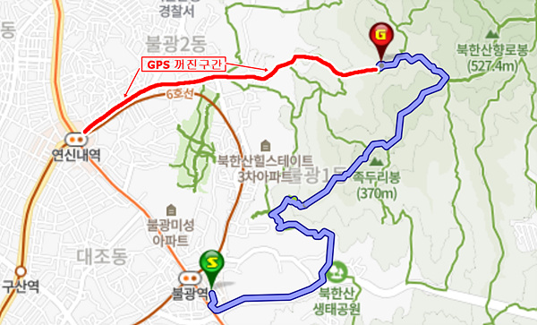 연신내역 까지는 약 6km 정도다, 중간에 GPS가 꺼저서 지도를 이었음
