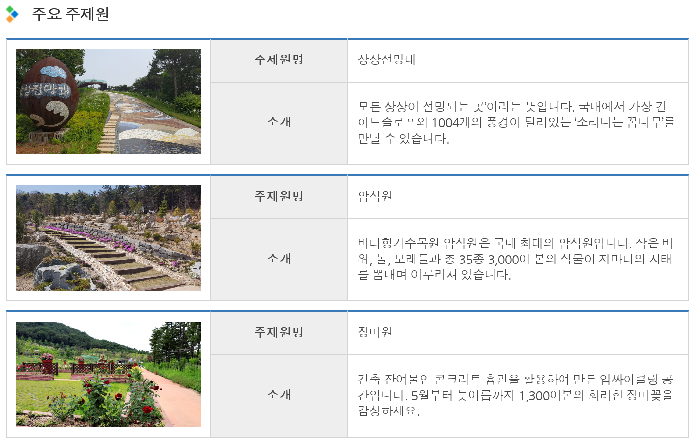 있는 ‘상상전망돼’를 비롯한 바다너울원, 암석원, 장미원 등 특색있는 여러 주제원은