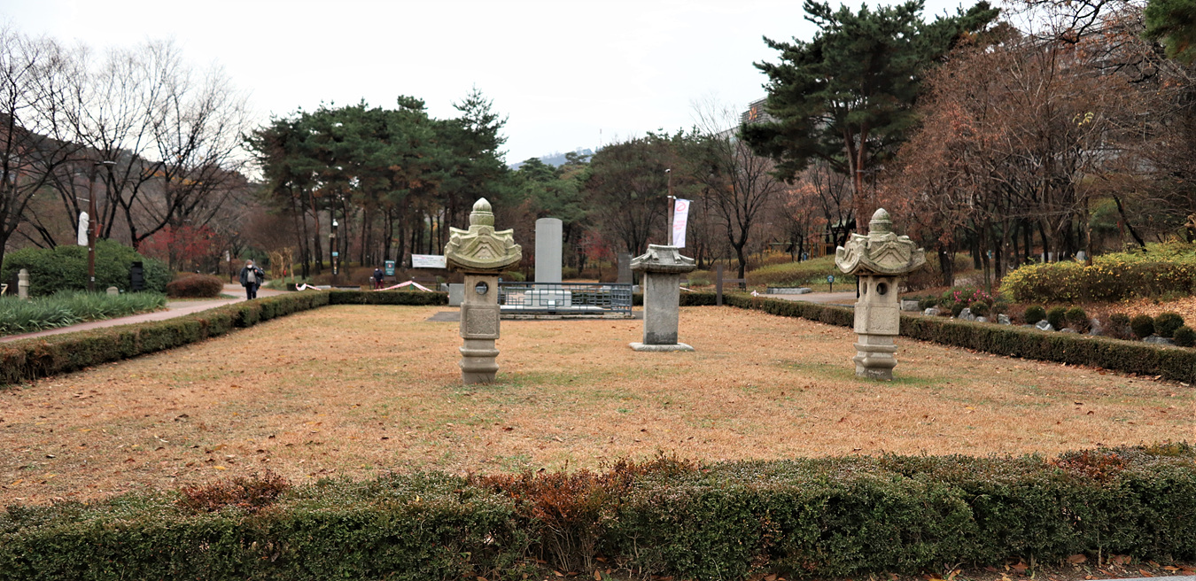 장충단 입구에 있는 장충단 비 와 석등이 보인다,