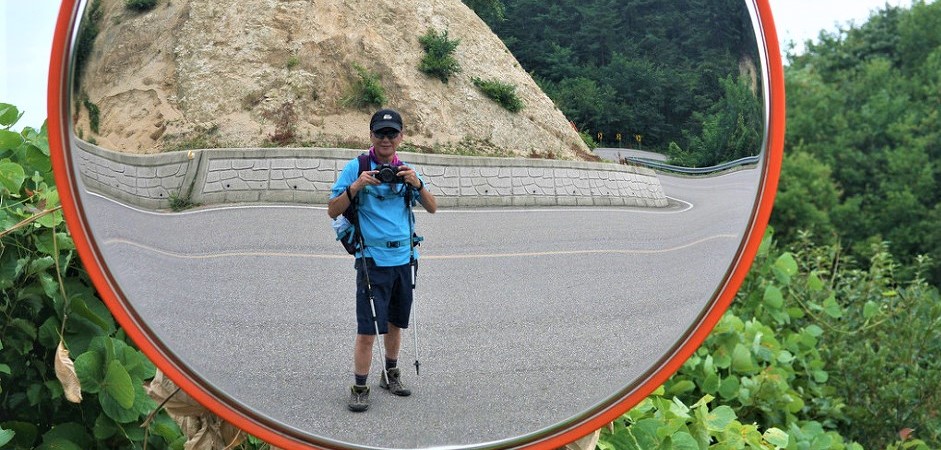 반사경으로 오늘 이길을 가고 있었음을 자축하는 의미의 인증 사진을 찍었다,