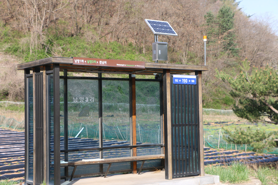 동해 심곡 약천마을 정자앞 너른 공터에는 버스 장류장이 있다,