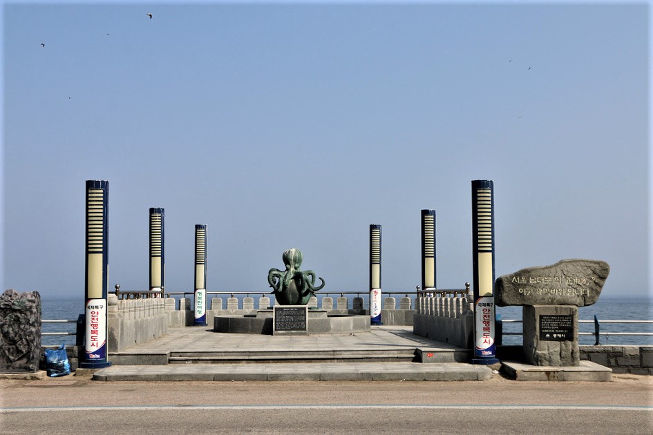 바위가 까막바위고 오른쪽에 있는 조형물이 문어상이다, 문어상에 얽힌