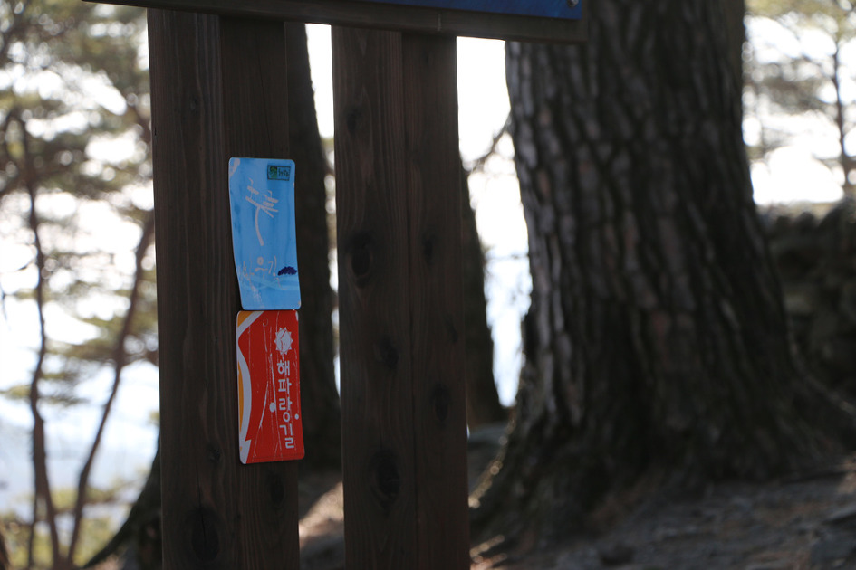 이 길이 해파랑길과 바우길임을 알리는 작은 스티커도 붙어 있다,