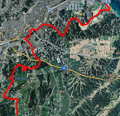 동해안 국토종주 자전거길인 해파랑길(청색 실선)을 따라 강릉항으로 왔다,