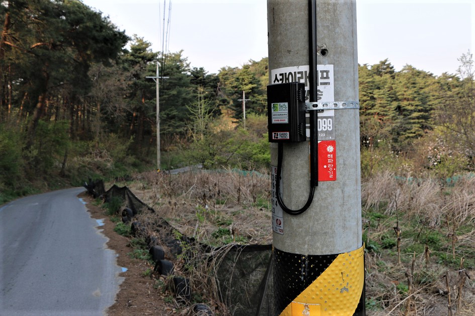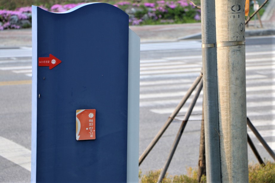 가로등에 붙어 있는 해파랑길 안내 스티커 화살표가