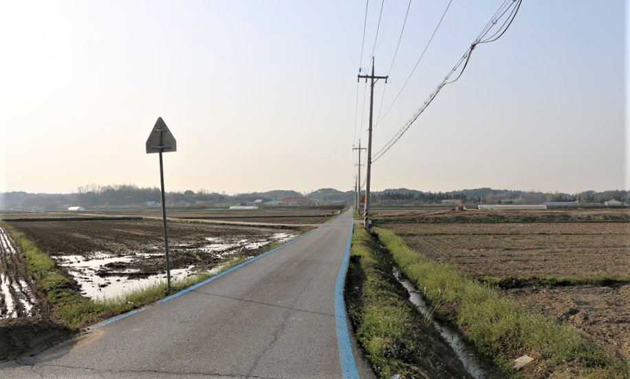 농로 양쪽에 해파랑길 자전거길 표식인 하늘색 실선을 따라간다,