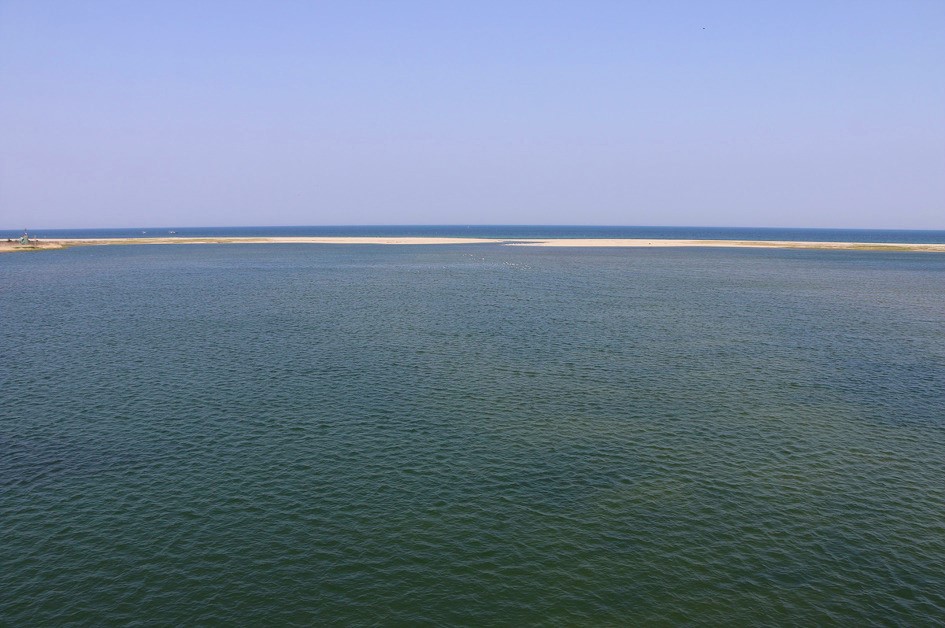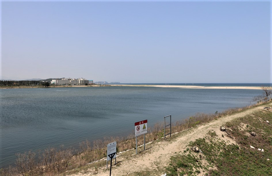 하류를 바라보니 남대천과 바다는 퇴적 모래톱으로 끊어저 있다,