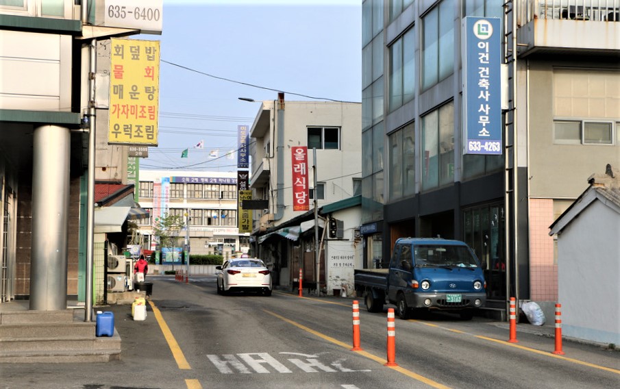 가는길 양쪽에는 상가 가 밀집되여 있는 동명동 마을이다,