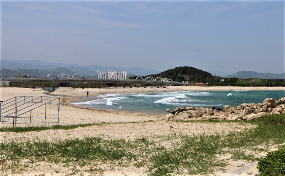 문암대교를 건너 가면서 보이는 백사장과 항구는