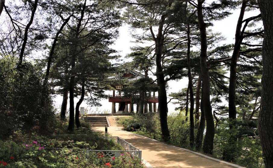 데크길 끝 산위에 보이는 정자가 청간정 이다