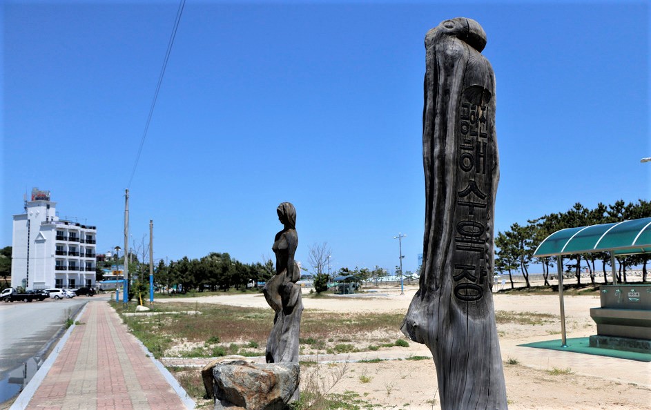 해변에 세워진 장승같이 만든 조형물은 공현진해수욕장이라는