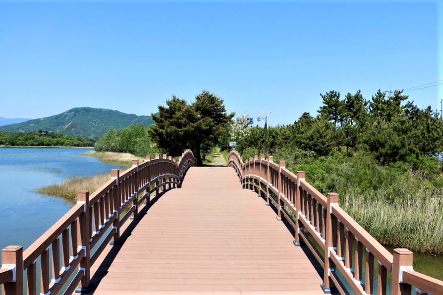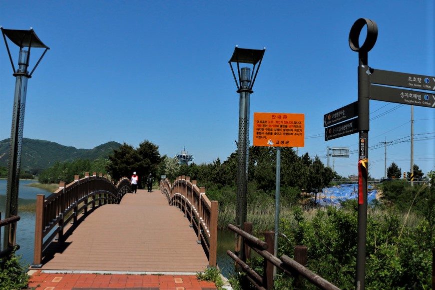 송지호에서 바다로 나가는 물길을 건너가는 목재 다리를 건너간다,