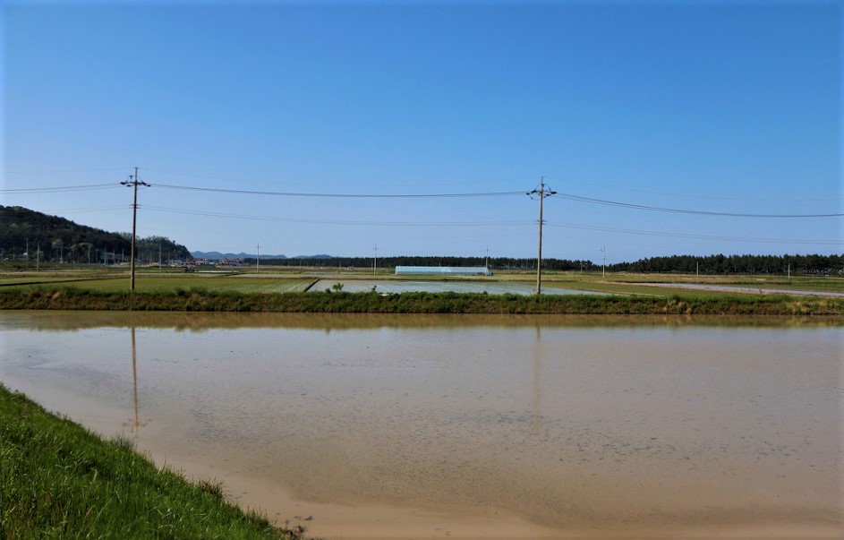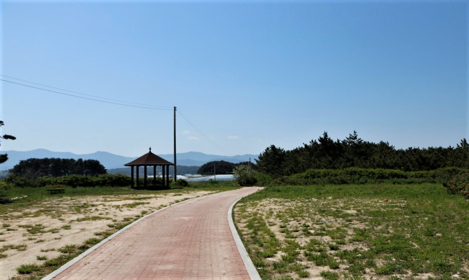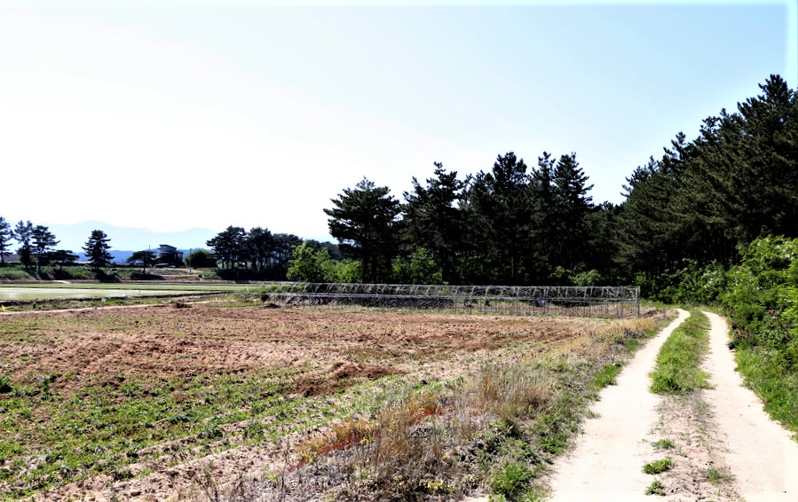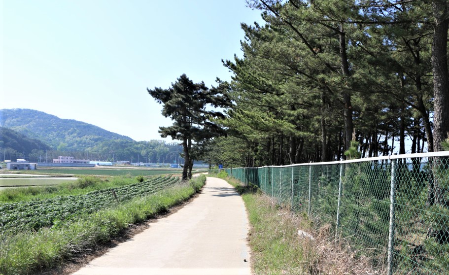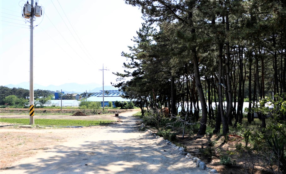 울창한 송림은 바닷가이고 왼쪽으로는 넓은 농토다,