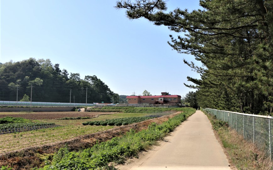 쭉 뻗은 일자형 둑길이지만 오른쪽은 북천, 왼쪽에는 농촌 마을이라