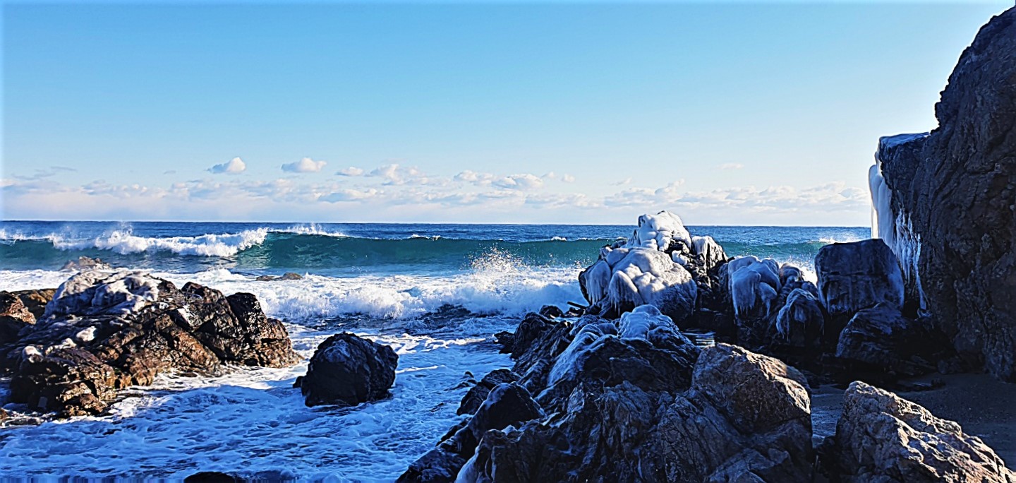 파도로 포말(泡沫)된 바위가 꽁꽁 얼어붙엇다,