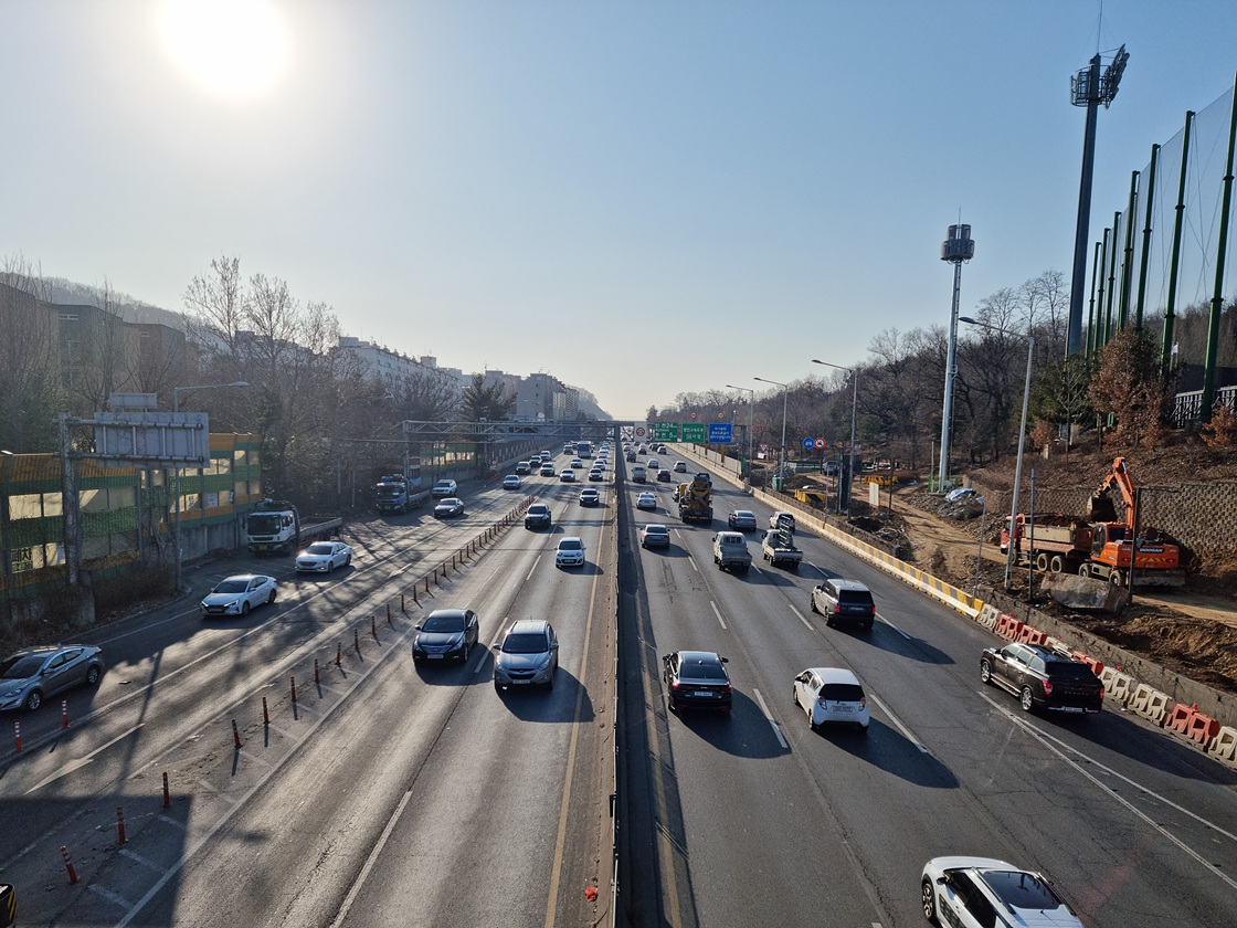 앞에 보이는 고가도로 뒤 산이 보인다,