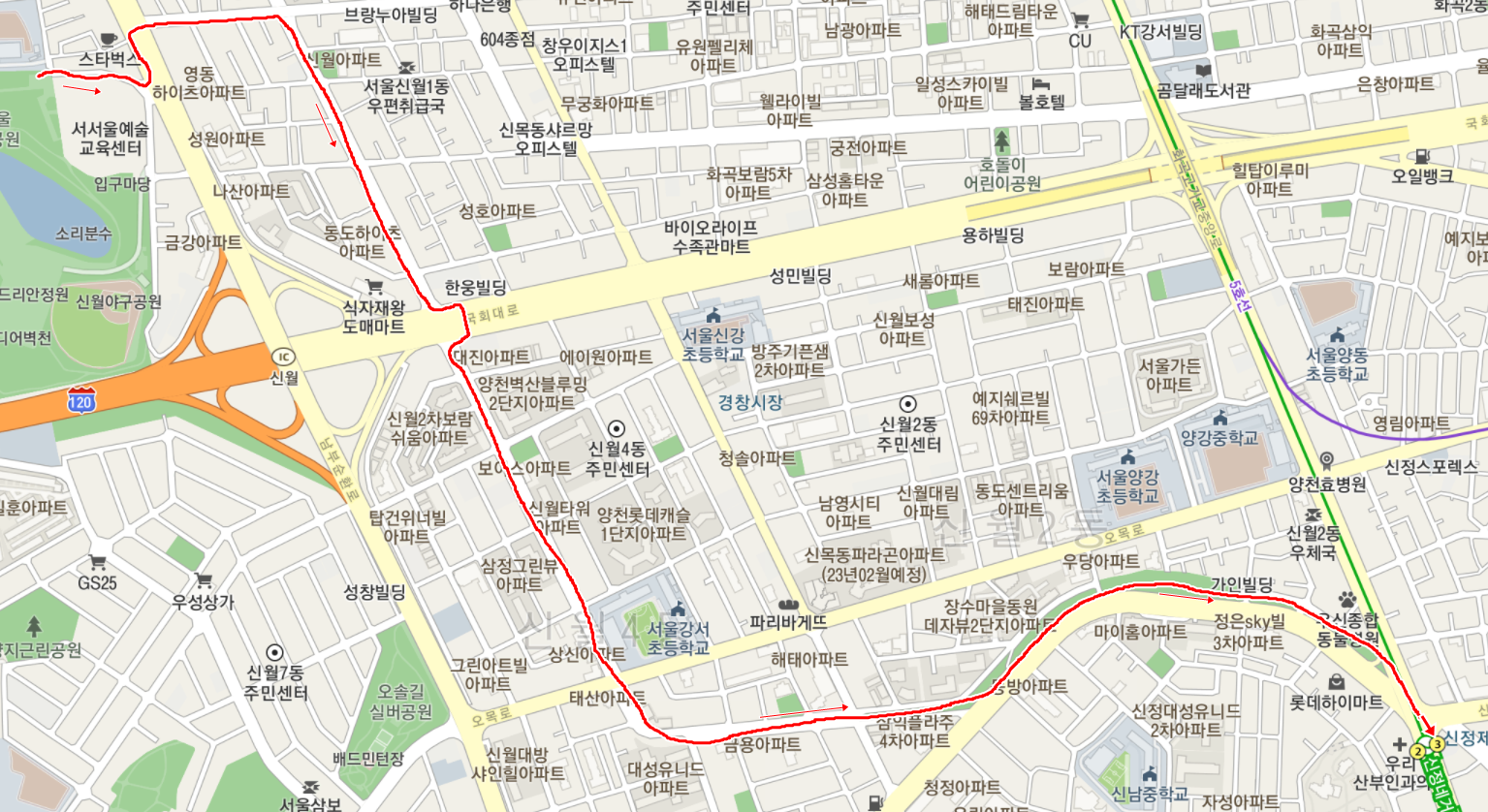 남부법원과 신서초등학교 사이 목동서로10길을 540m 정도