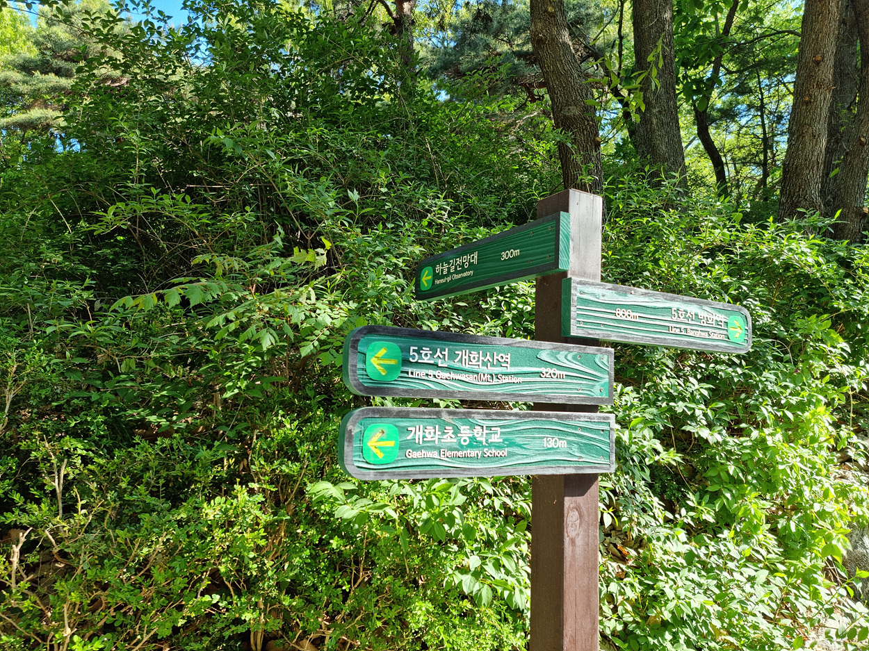 5호선 개화산역 2번 출구 양천로를건너 개화초등학교로 들어가면 개화산 하늘전망대로가는 개화산 들머리가 있다,