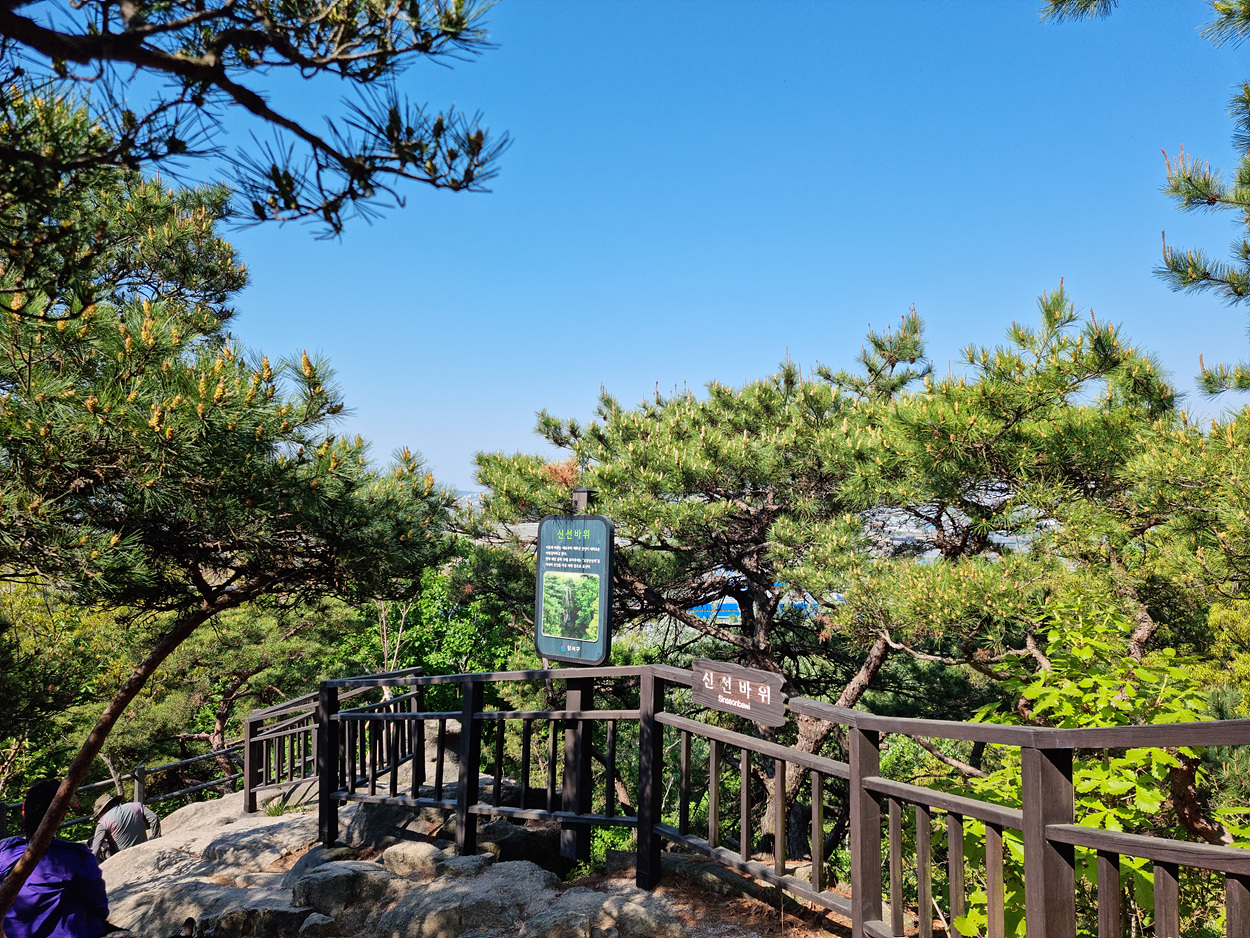 데크 계단을 따라 올라가다보니 신선바위 안내가 보인다, 아랫쪽 숲속에서 보면 거대한 바위가 절벽처럼 솟은 풍경이 보인다고 해서 신선바위 또는 신선대라고 하는 바위지만 윗쪽 강서들레길에서는 사진에 보이는게 전부다,