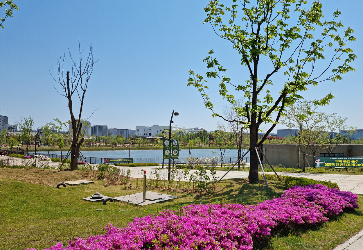 서울식물원 호수가 서울식물원습지원으로 연결되는 양천로(한강)방향과