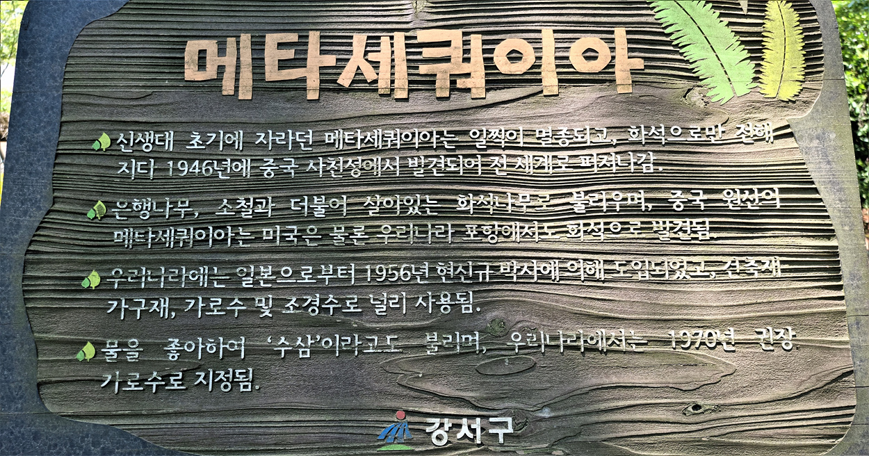 서남환경공원 끝에는 메타세쿼이아 나무 유래 안내도 있는데 이 나무는 살아있는 화석나무라고 했다, 신생대 초기에 자라든 나무로 일찍 멸종되여 화석으로만 전해지든 나무라고 하니 귀한 나무인 것만은 사실인것 같다,