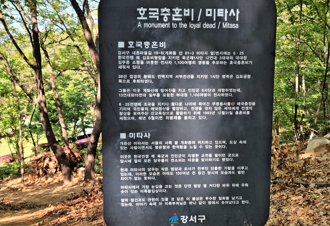 38선 접경의 황해도 연백지역에서 서부전선을 지키든 1사단 병력은 김포공항쪽으로 후퇴하여 이곳 개화산에 방어진을 치고 인민군 6사단과 전투에서 13연대와 15연대 일부를 포함한 부대원 1,100명이 전사했다, 6,25전쟁때 조국을 지키다 죽어간 무명용사들의 애국충정을 기리며 1993년 충혼비를 세웠어며 매년 6월 위령제를 올린다, 라는 내용이 안내판에 적혀있다, 우리가 잊고 살아가는 전쟁은 아직도 끝난게 아니다,