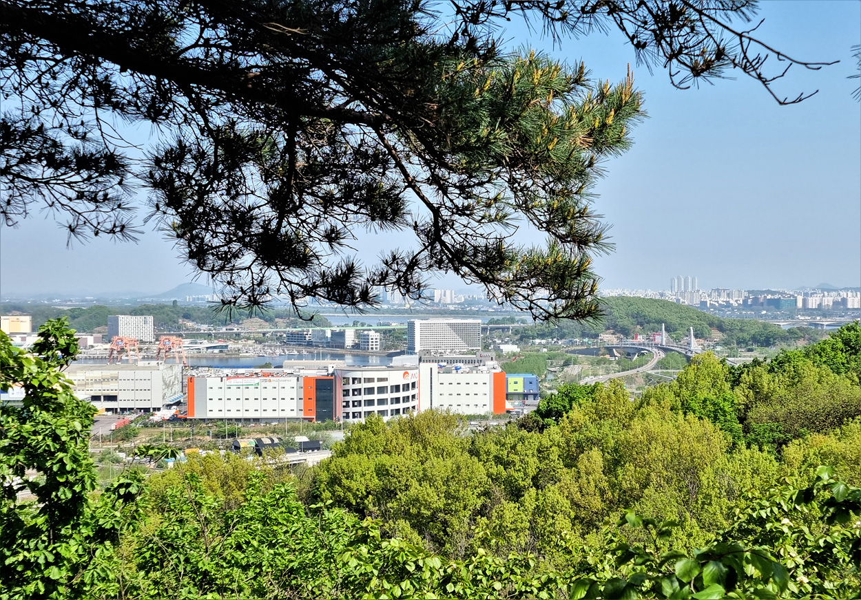 앞에 보이는 다리는 방화대교며 숲에 가려서 행주산성은 보이지 않는다, 그러나 북한산 보현봉과 대남문일대 북한산성 주능선과 만경대와 백운대일대 까지의 전경이 너울지듯 흘러내린다,