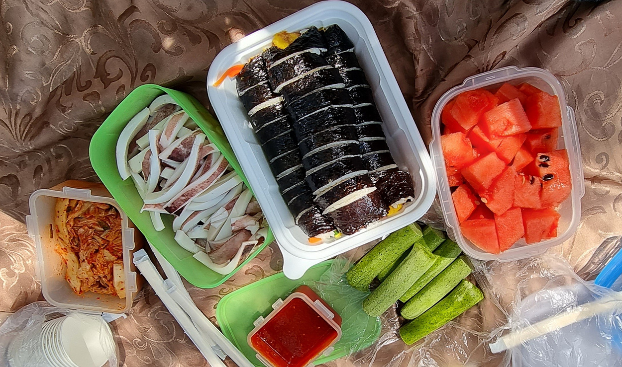 바위 위에서 자리를하고 간식을 먹었다,