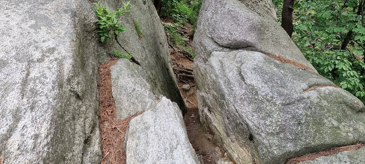 한사람이 겨우 삐집고 나갈 것 같은 작은 바위 틈새를 지나