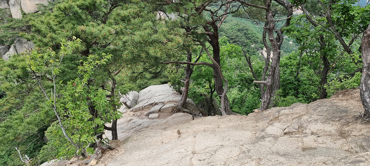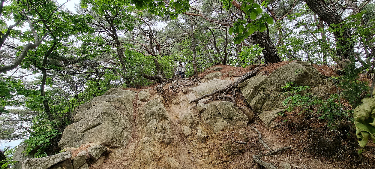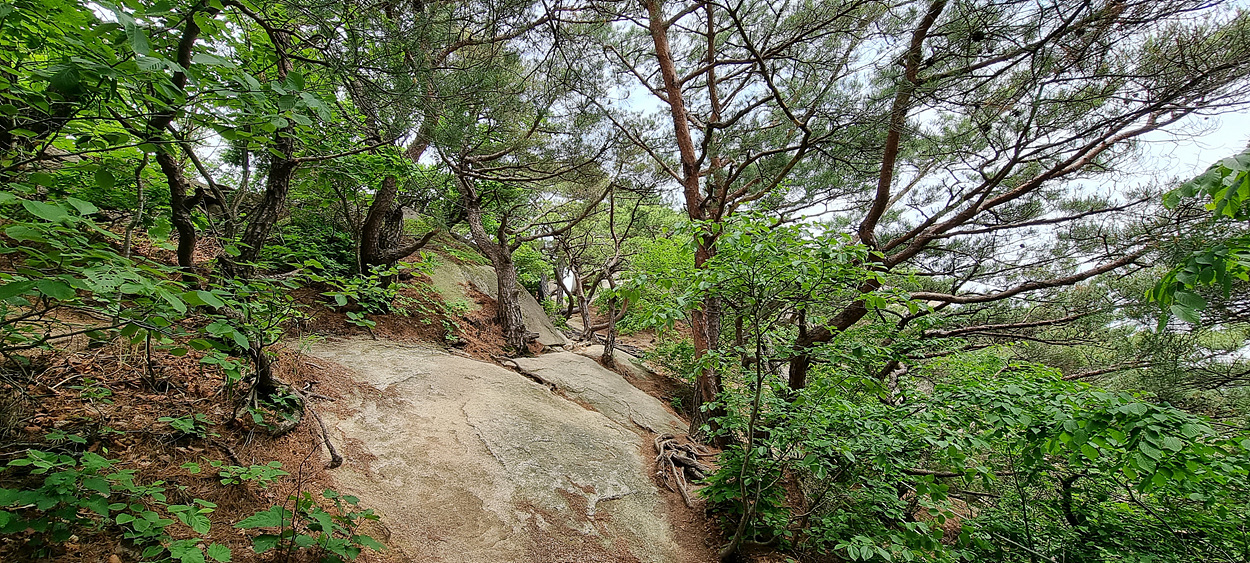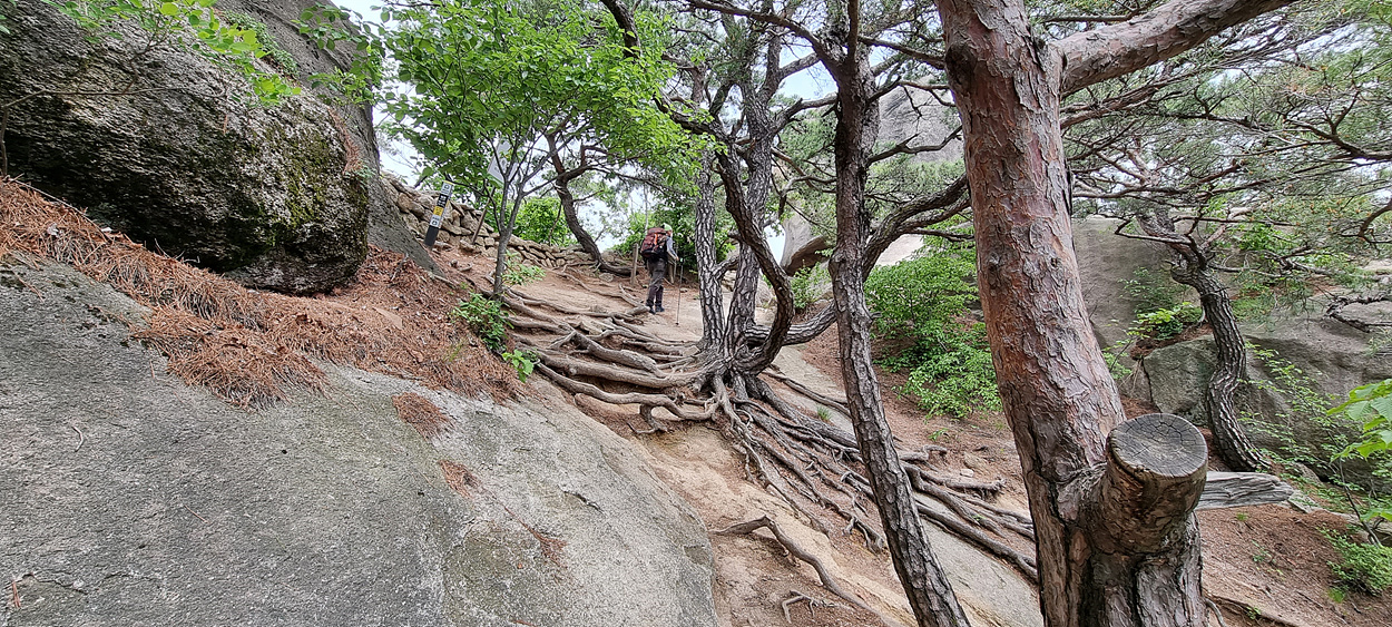 흙은 암반에 살작 뿌려저있고 흙 아래는 암반이다, 그럼에도 소나무가 뿌리를 넓게 뻗어서