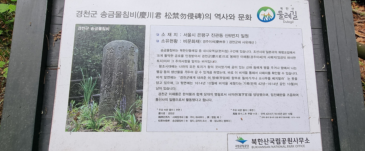 소나무를 베지말라 뜻을 담고 있어며 그 뒷면에는 1614년 10월에 비석을 세웠다는