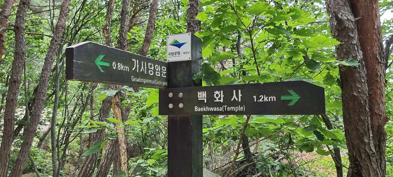 백화사를 지나 도로까지는 약 1km정도며 오른쪽 북한산성입구 교차로 까지도 1km정도다,
