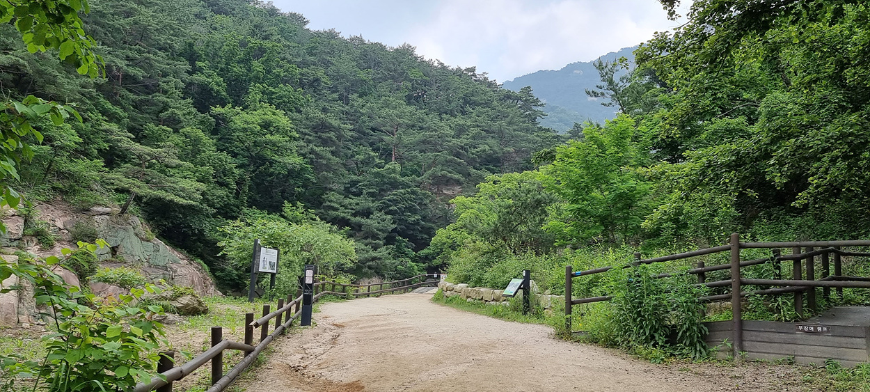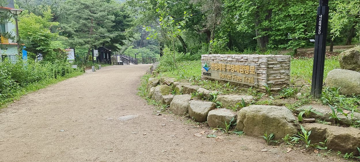 산성계곡 무장애 탐방길로 들어간다,