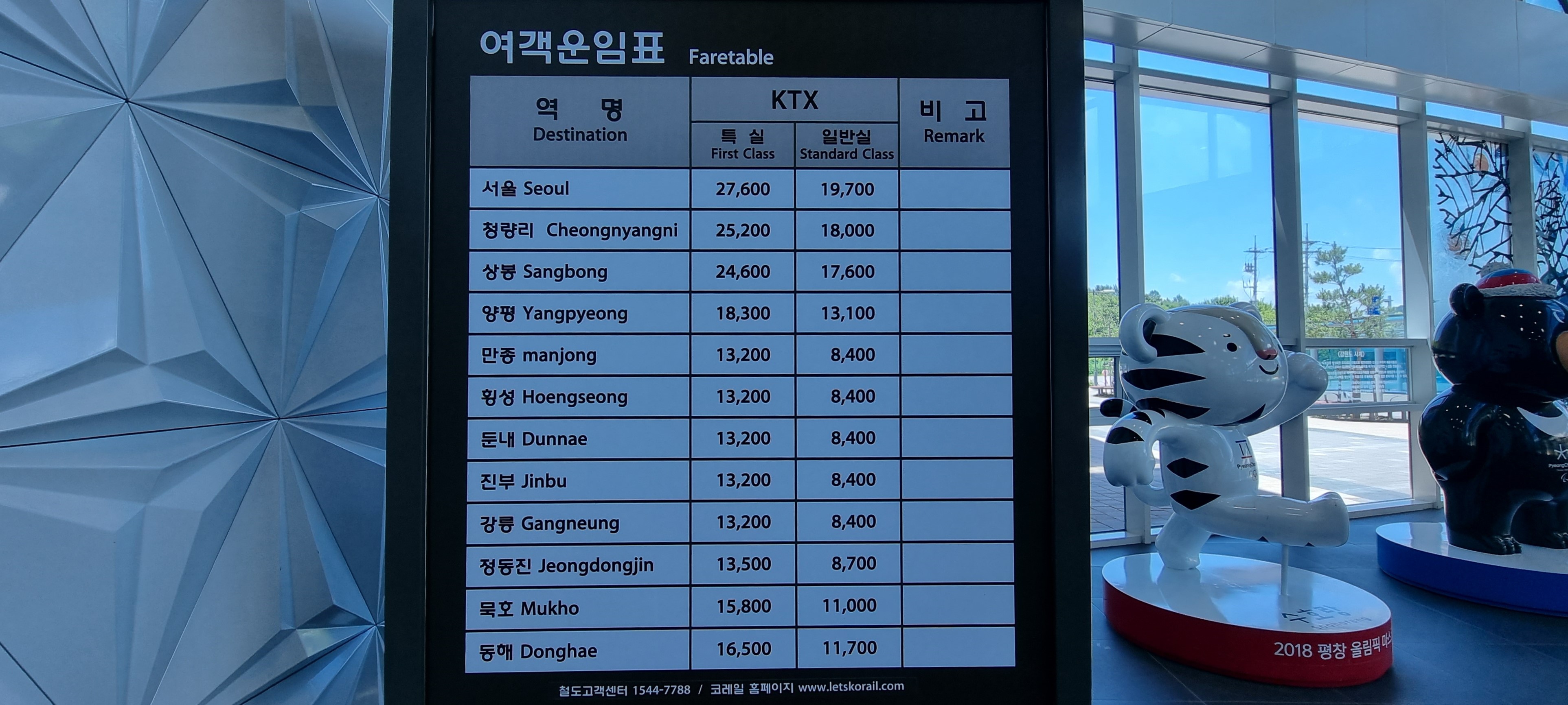 평창역을 중심으로 하는 열차 여객운임표도 있다,