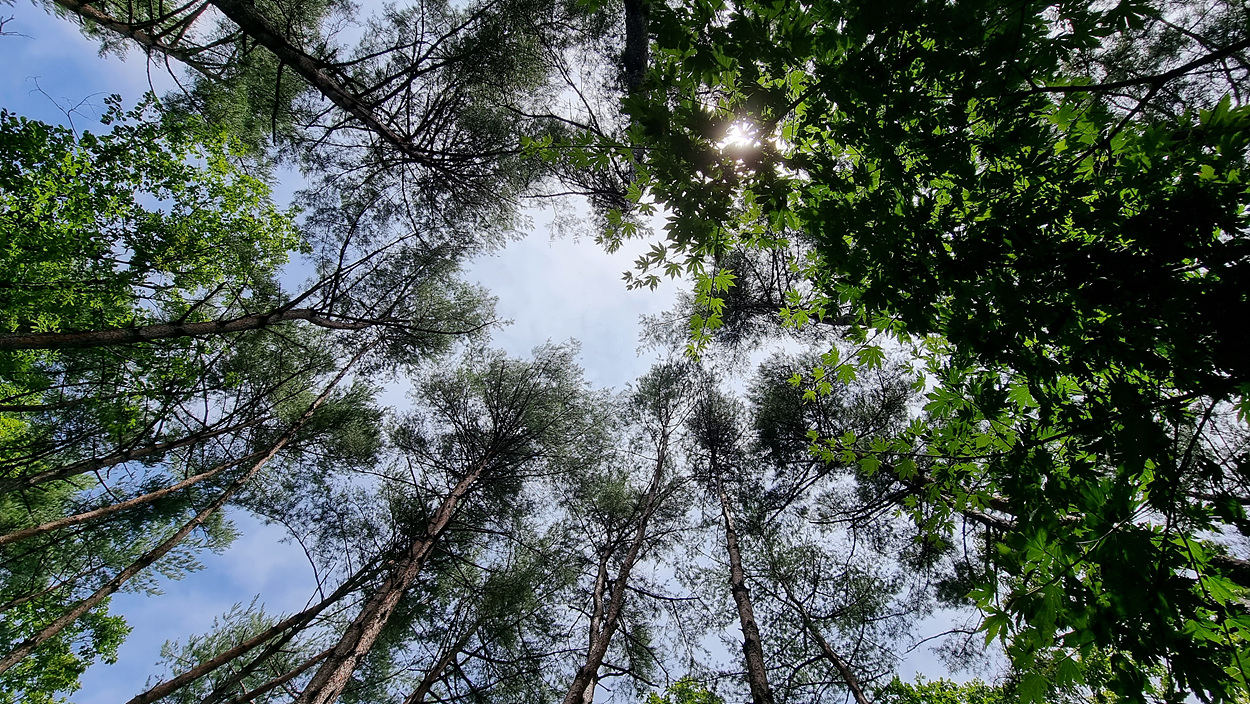 길게 자란 소나무가 하늘을 찌르듯이 높게 솟아 올라있다,
