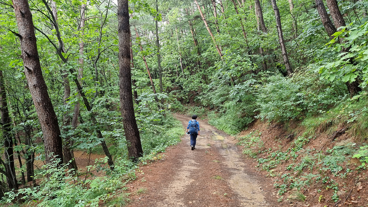 울창한 소나무 숲길로 올라간다,
