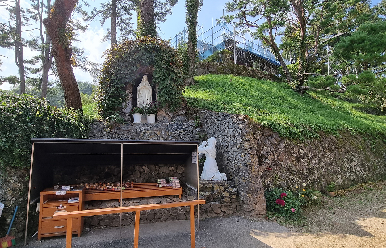 열을 지어있고 왼쪽 언덕 아래엔 성모 마리아상이 있다.