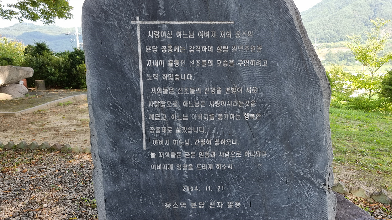 용소막성당 신자들의 간절한 기도문 비석이 있는게 보인다,