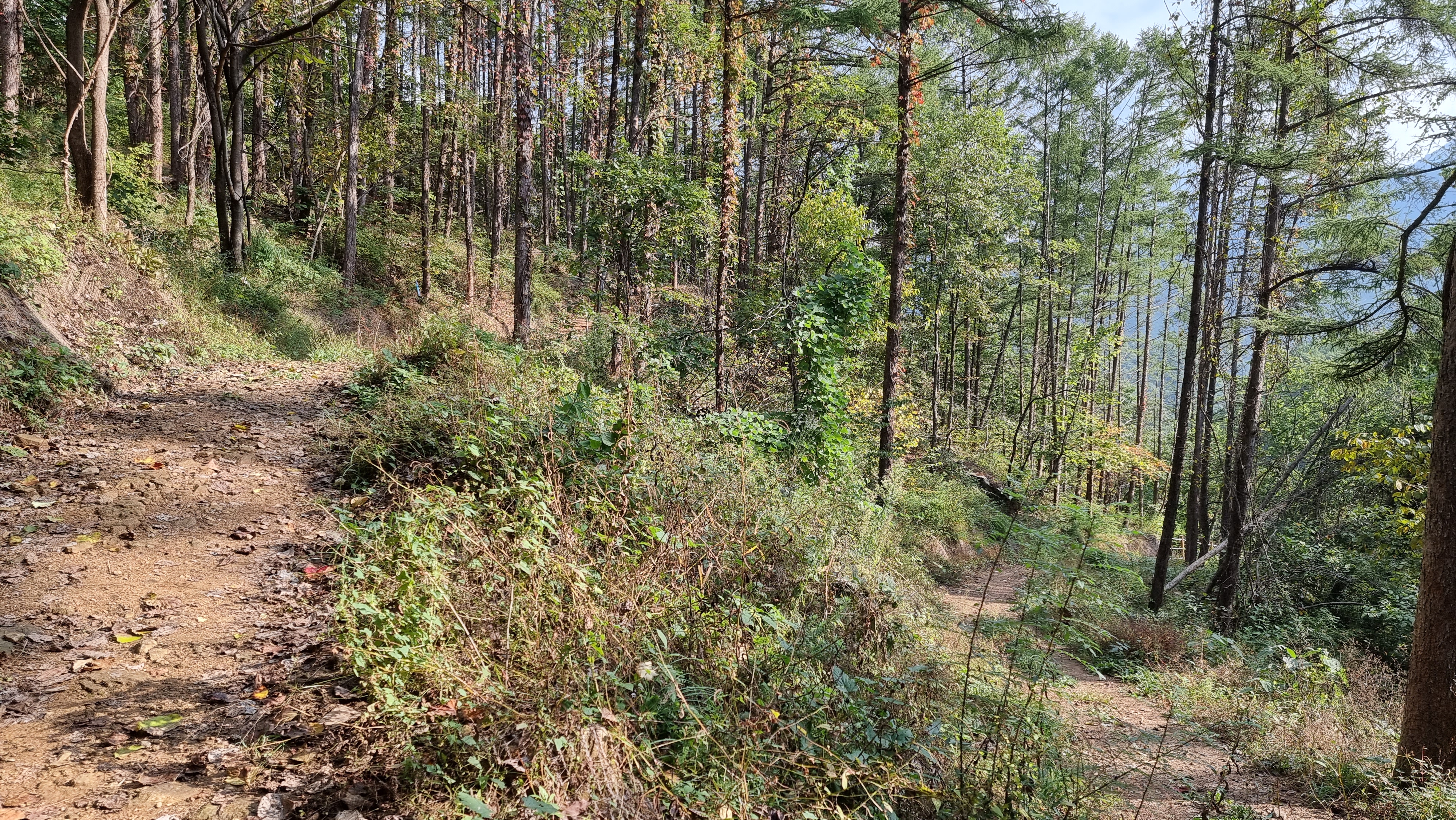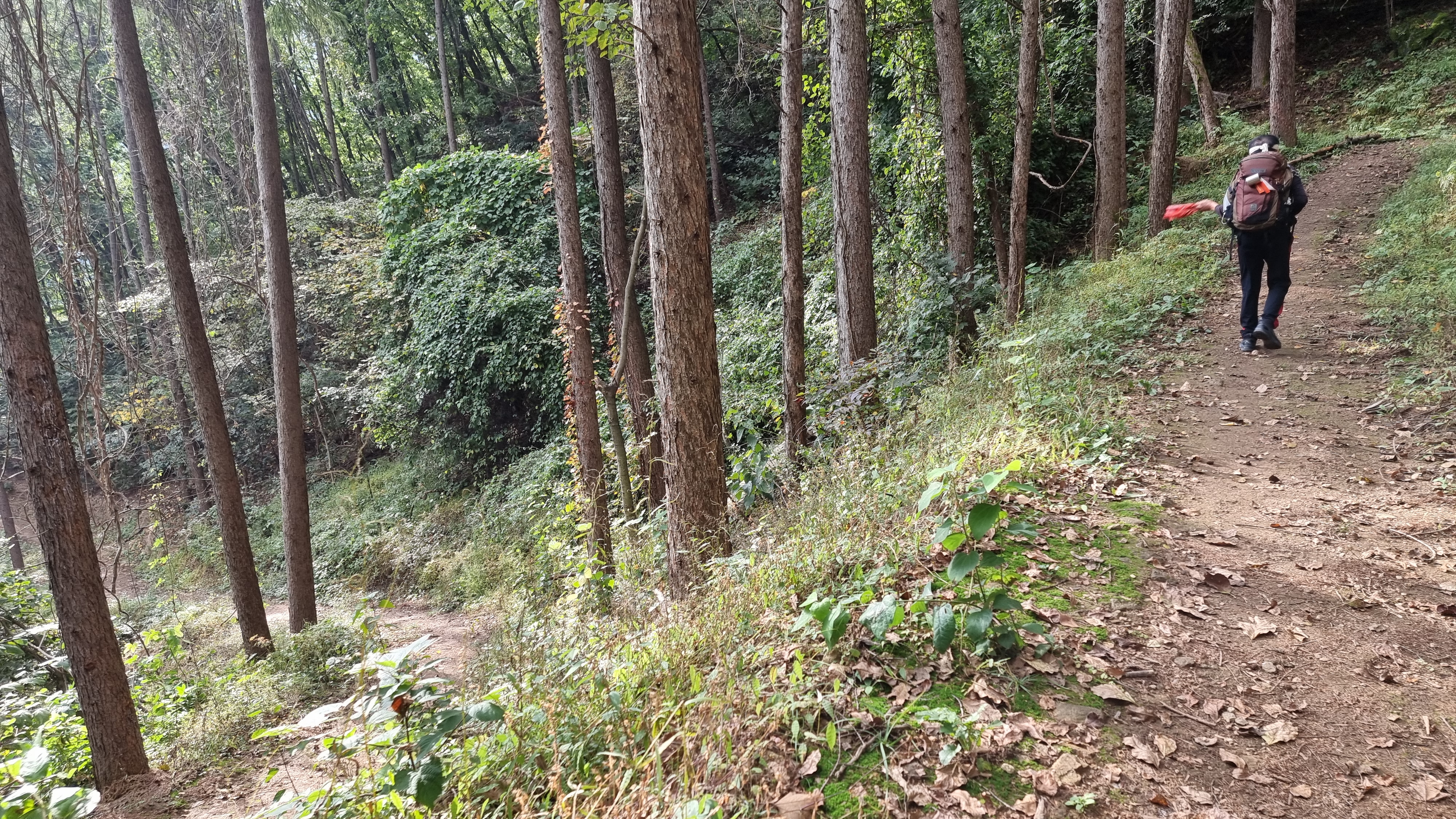 높이의 크고 작은 능선과 골자기 길을따라 다양한 수종의 숲을 만나게 된다, 이구간에는