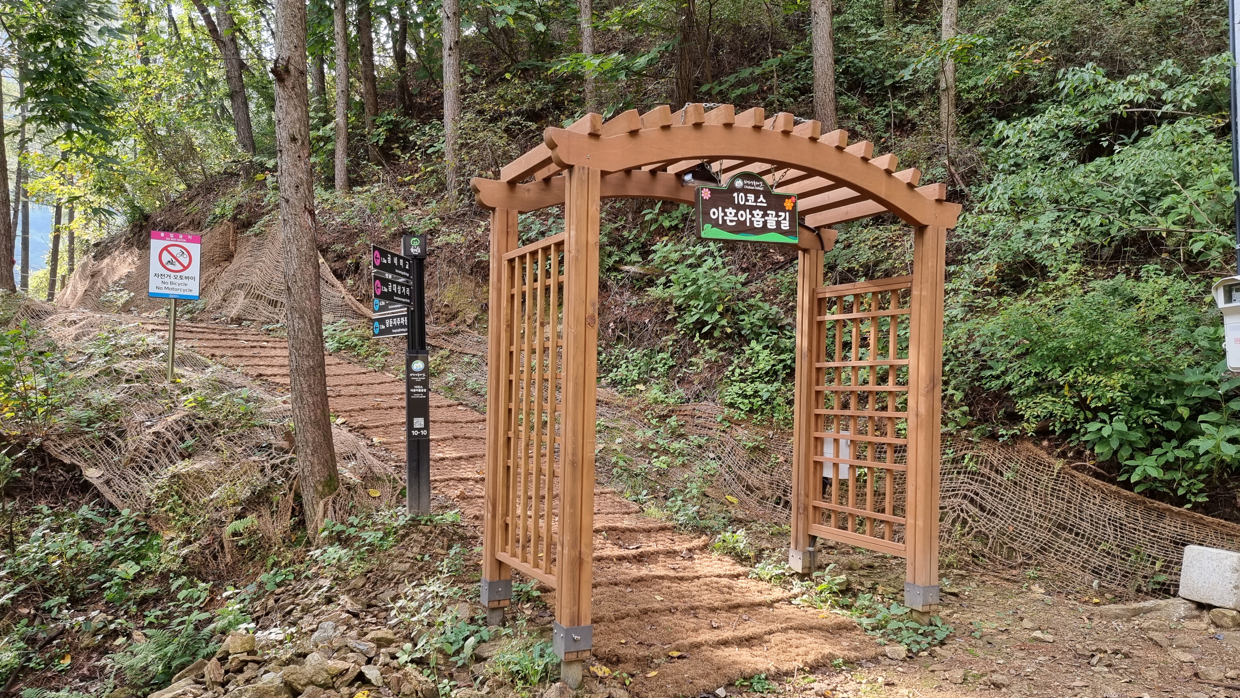 이제 둘레길 산길구간을 알리는 10코스 출입문을 들어간다,