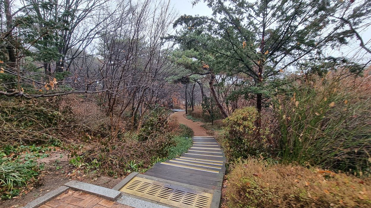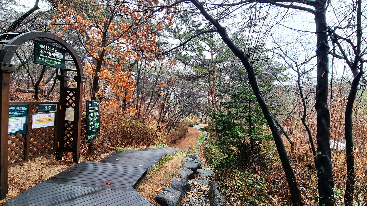 국립극장 뒤 남산공원 유아숲 체험장을 지나간다,