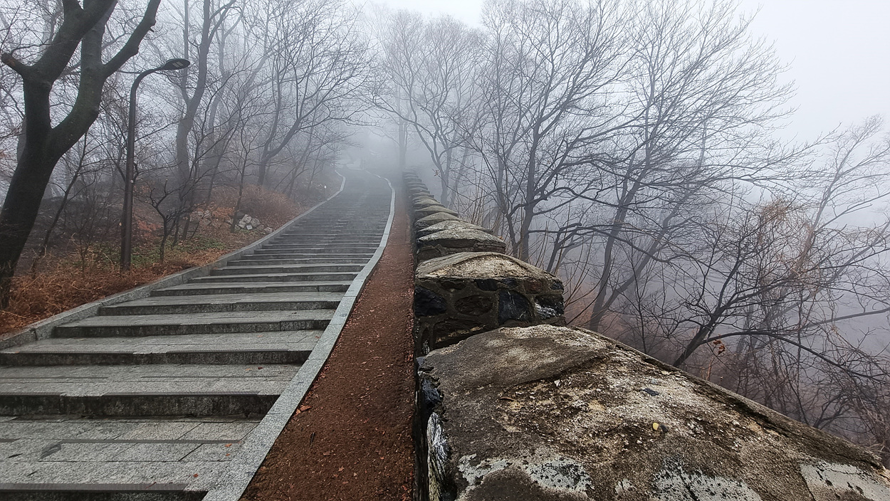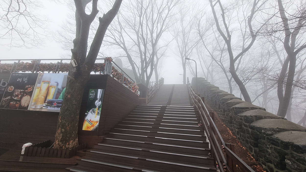 한양도성 옆 계단으로 남산 정상으로 올라간다,