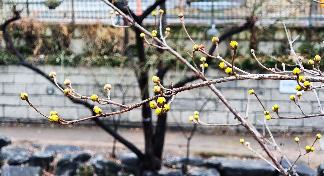 보이지 않았는데 처음으로 꽃이 피여나는 산수유를 보았다,