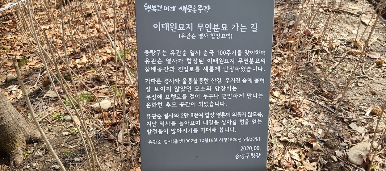 합장된 이태원묘지 무연분묘의 참배공간 진입로를 단장했다는 안내가 보인다,