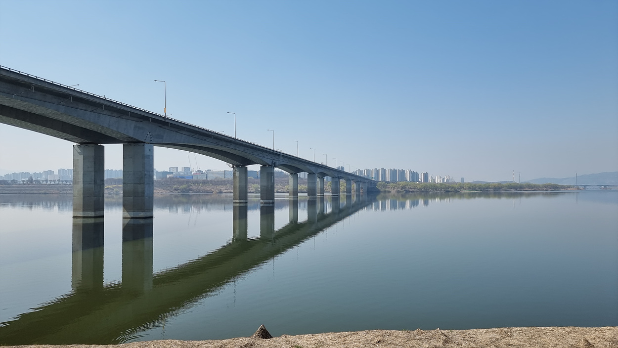 한강 상류에 가물거리듯이 보이는 팔당대교