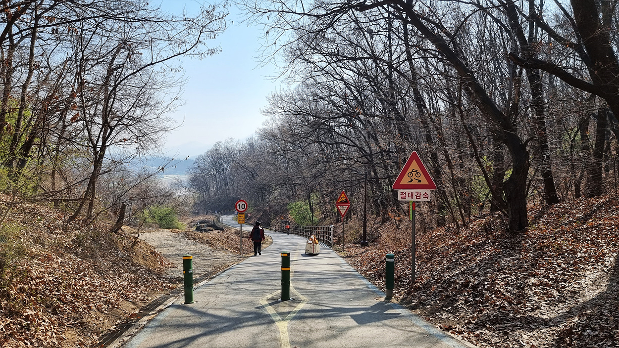 버드나무집에서 부터 고개넘어까지는 자전거 통행을 조심해야 하는 길이다,