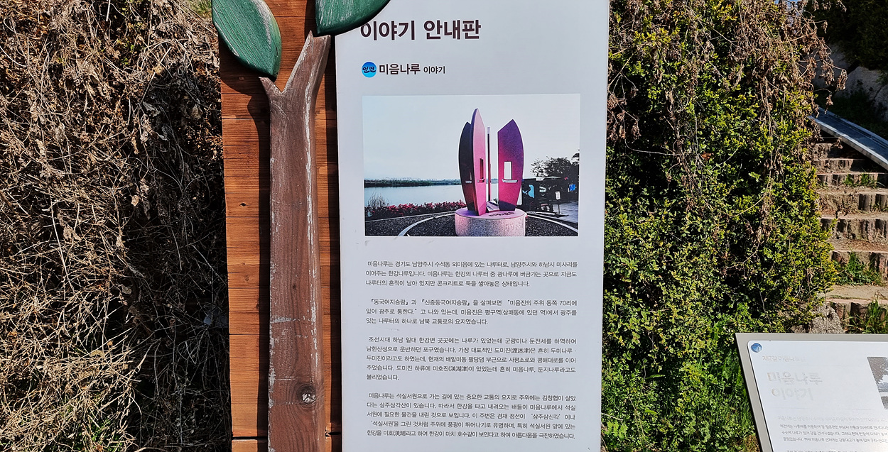 언덕으로 올라 가다 보니 미음나루 이야기 안내판도 있다,